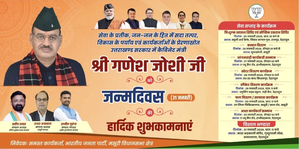 गौरतलब है कि 25 से 31 जनवरी तक मसूरी विधानसभा क्षेत्र के विभिन्न क्षेत्रों में कैबिनेट मंत्री गणेश जोशी के जन्मदिवस को सेवा सप्ताह के रूप में मनाया जा रहा है।जिसमें सेवा भाव के कार्य किए जा रहे है।