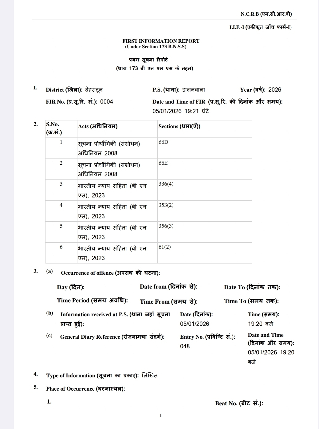 आईटी एक्ट 66 D , आईटी एक्ट 66E , BNS 336 (4) BNS 353 (2) BNS 356 (3) BNS 61 (2) में मुकदमा हुआ दर्ज