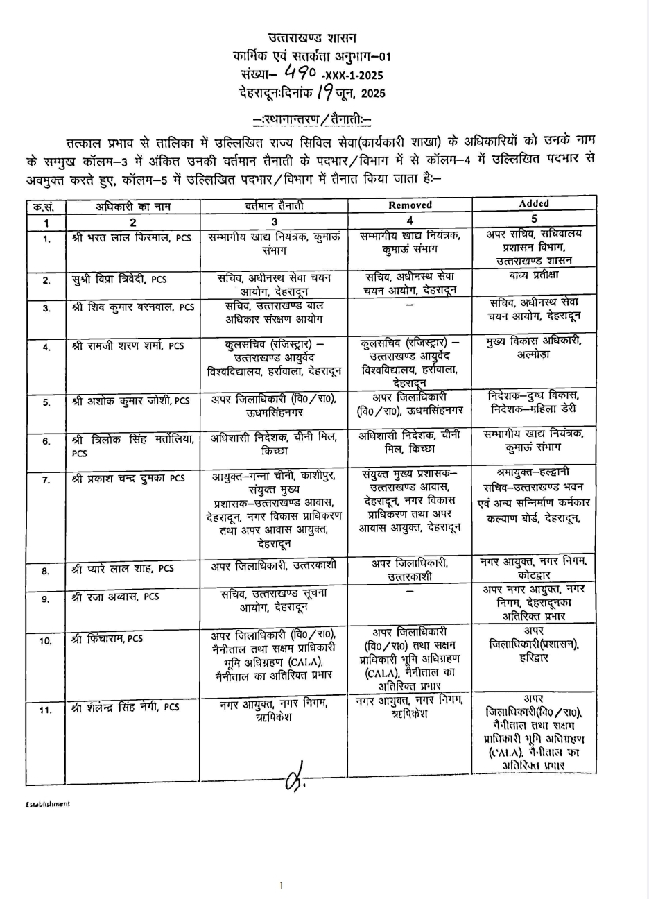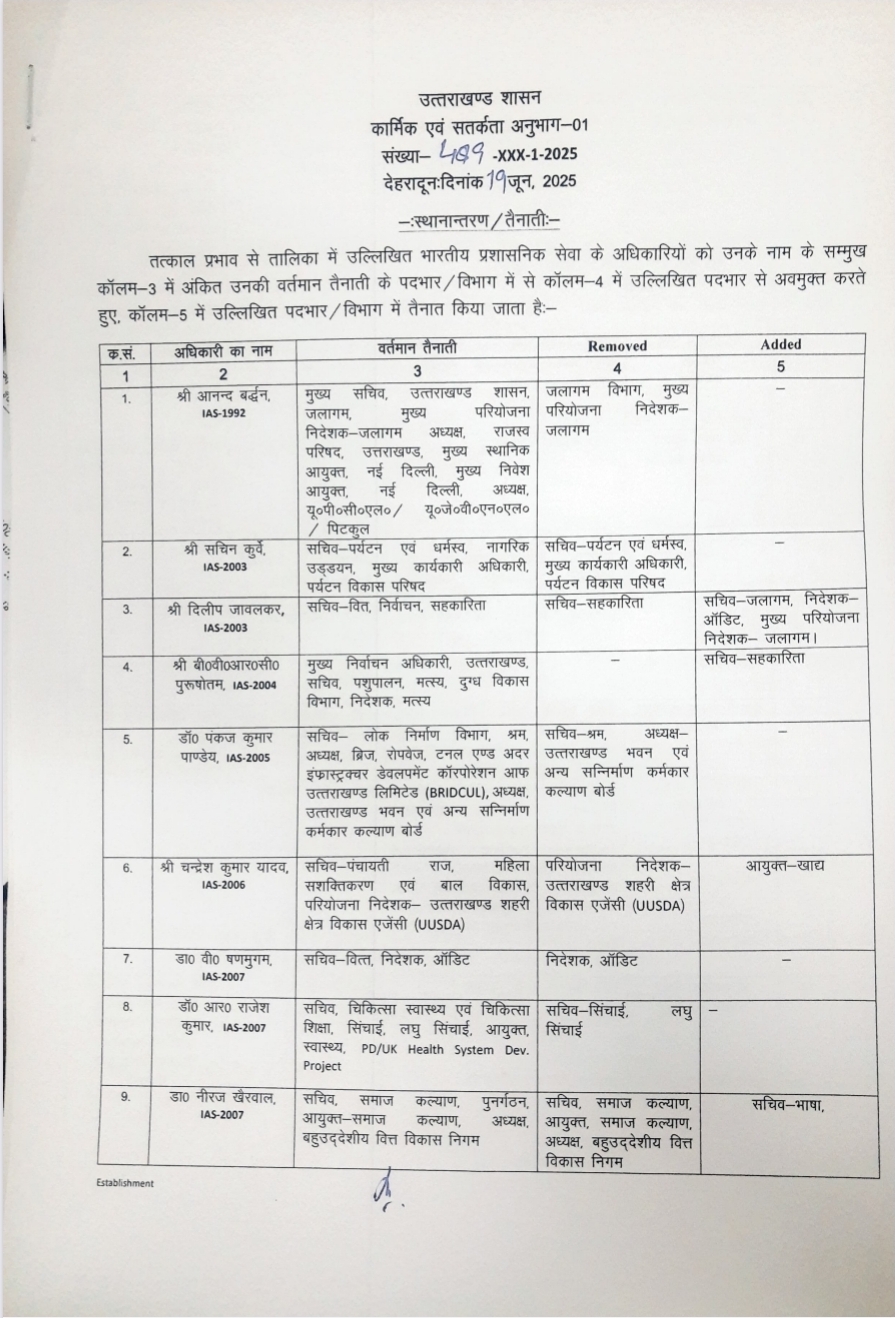 उत्तराखंड से बड़ी खबर उत्तराखंड से बड़ी खबर,बड़े स्तर पर IAS और PCS अधिकारियों को तबादले June 19, 2025 Apnu Uttarakhand
