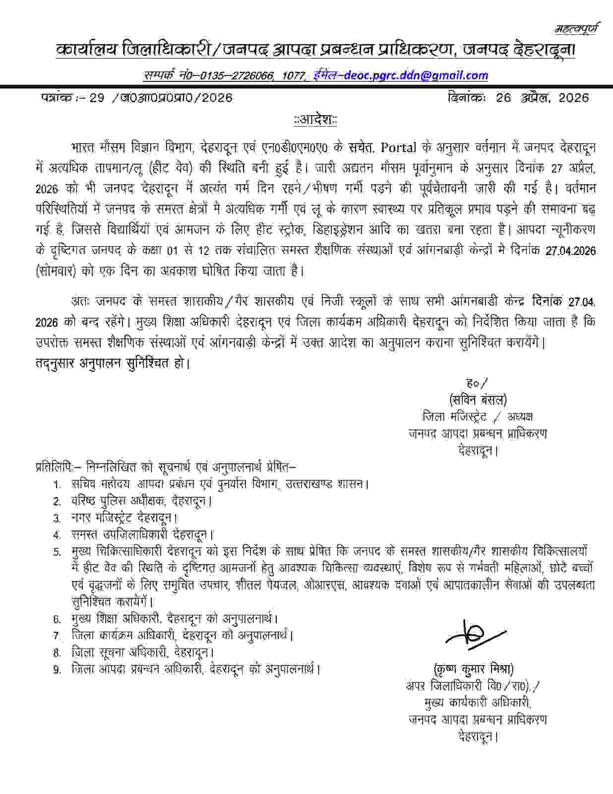 देहरादून। मौसम विज्ञान केंद्र देहरादून के द्वारा 27 अप्रैल को भी हीटवेव की संभावना व्यक्त की गई है,जिसके चलते देहरादून के जिलाधिकारी सबिन बंसल के द्वारा जनपद के सभी आंगनवाड़ी सरकारी और प्राइवेट स्कूलों को कक्षा 12 तक के लिए बंद रखने का आदेश जारी कर दिया गया है।