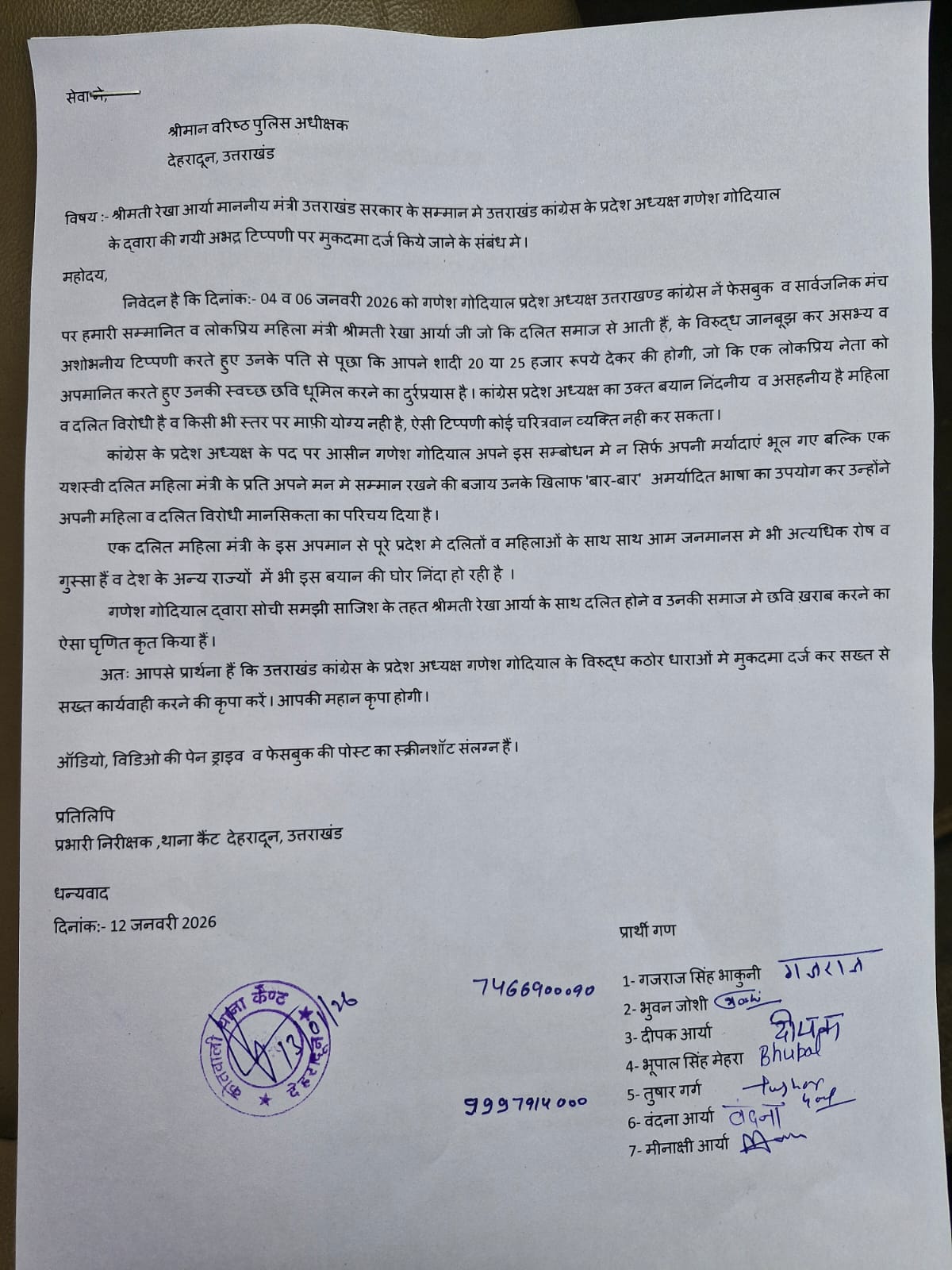 शिकायतकर्ताओं ने बताया कि 4 और 6 जनवरी 2026 को गणेश गोदियाल ने फेसबुक और सार्वजनिक मंचों पर मंत्री रेखा आर्या के बारे में आपत्तिजनक टिप्पणी की।
