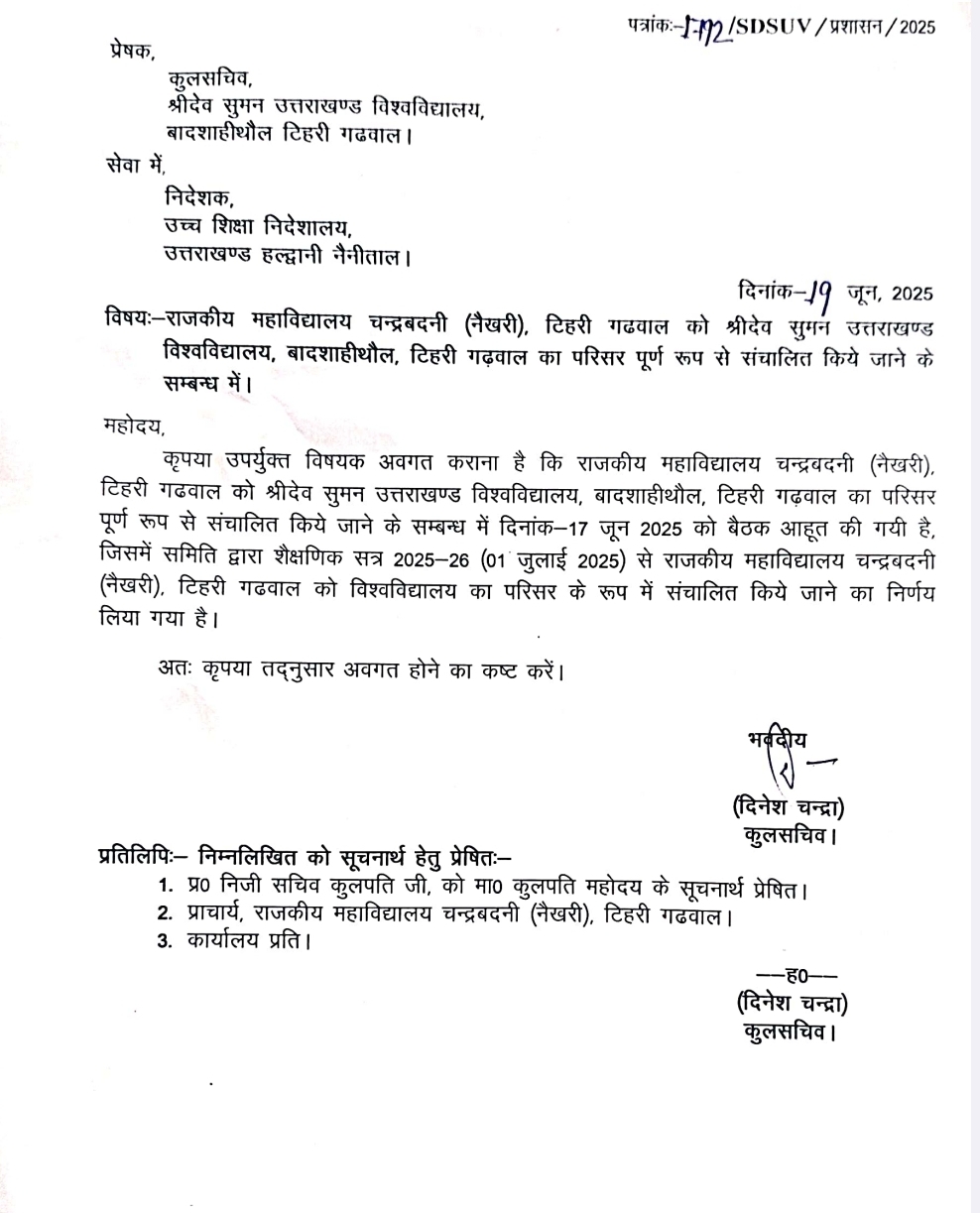 देहरादून। टिहरी जनपद के राजकीय महाविद्यालय चंद्रबदनी नैख़री में श्री देव सुमन विश्वविद्यालय के कैंपस बनाए जाने को लेकर बड़ी खबर सामने आ रही है। मुख्यमंत्री पुष्कर सिंह धामी के द्वारा घोषणा की गई थी कि राजकीय महाविद्यालय चंद्रबदनी नैख़री को श्री देव सुमन विश्वविद्यालय का कैंपस बनाया जाएगा,जिसको लेकर अब मुख्यमंत्री पुष्कर सिंह धामी की घोषणा पुरी हो गई है,शैक्षणिक सत्र 2025 – 26 में 1 जुलाई से नैख़री में कैम्पस की शुरूआत होने जा रही है। कैंपस की शुरूआत होने ये साथ डारेक्टर भी नैख़री में बैठेंगे। देवप्रयाग विधायक विनोद कंडारी मुख्यमंत्री पुष्कर सिंह धामी के द्वारा की गई घोषणा के तहत नैख़री में श्री देव सुमन विश्वविद्यालय का कैंपस 1 जुलाई से खुलने को लेकर मुख्यमंत्री पुष्कर सिंह धामी का आभार व्यक्त किया है,तो वहीं उच्च शिक्षा मंत्री धन सिंह रावत का भी आभार व्यक्त किया है। विधायक कंडारी का कहना है कि यह क्षेत्र के लिए एक बड़ी उपलब्धि है की नैख़री में श्री देव सुमन विश्वविद्यालय का कैंपस 1 जुलाई से शुरू हो जाएगा।