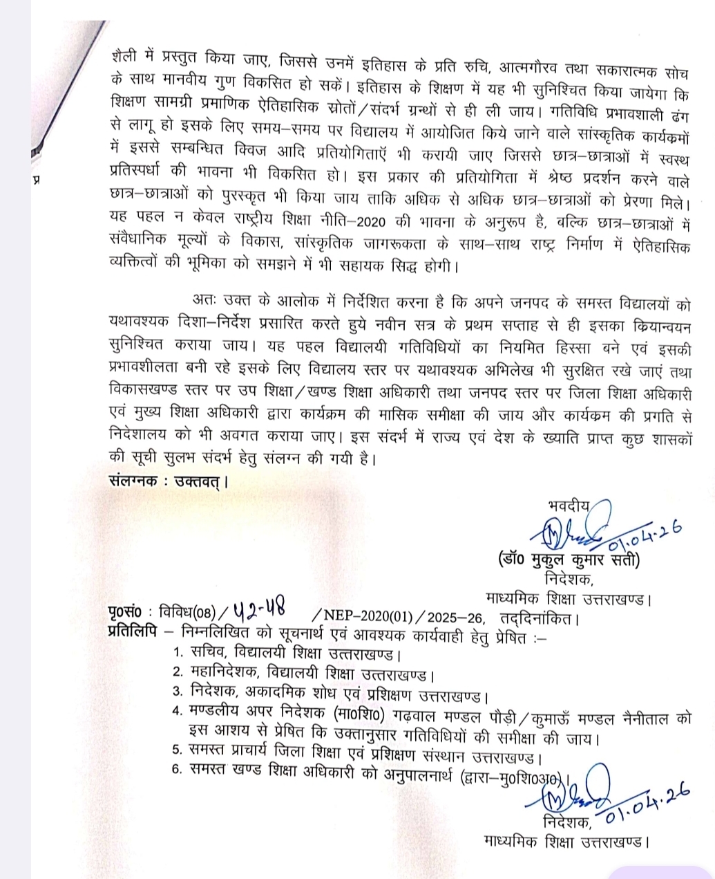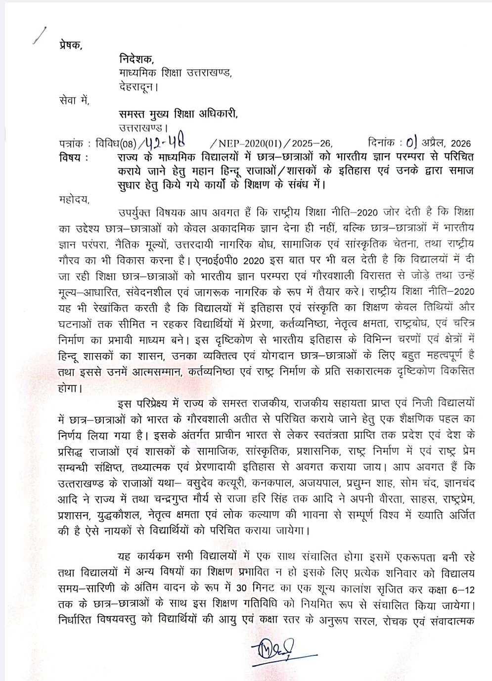 देहरादून। मुख्यमंत्री पुष्कर सिंह धामी के द्वारा शिक्षा विभाग को निर्देश दिए गए थे कि हिंदू राजाओं के समाज सुधार से जुड़े कार्यों और हिंदू राजाओं की जो गाथाएं रही है उन्हें छात्रों को पढ़ाया जाए जिसको लेकर शिक्षा विभाग के द्वारा आदेश भी जारी कर दिए गए साथ ही किन-किन हिंदू राजाओं की गाथाओं को छात्र पड़ेंगे यह भी आदेश में अवगत कराया गया है, माध्यमिक शिक्षा निदेशक डॉ मुकुल सती के द्वारा इसको लेकर आदेश जारी कर दिया गया है, शनिवार के दिन अंतिम वादन में छात्रों को हिंदू राजाओं की गाथाओं को पढ़ाया जाएगा।