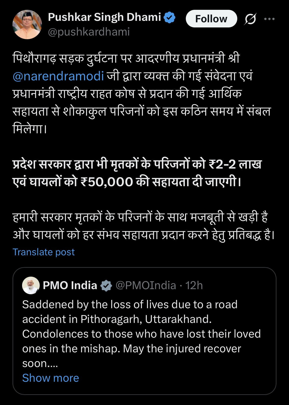 पिथौरागढ़ : सड़क हादसे पर पीएम ने जताया दुख, केंद्र सरकार ने किया मुआवजे का एलान