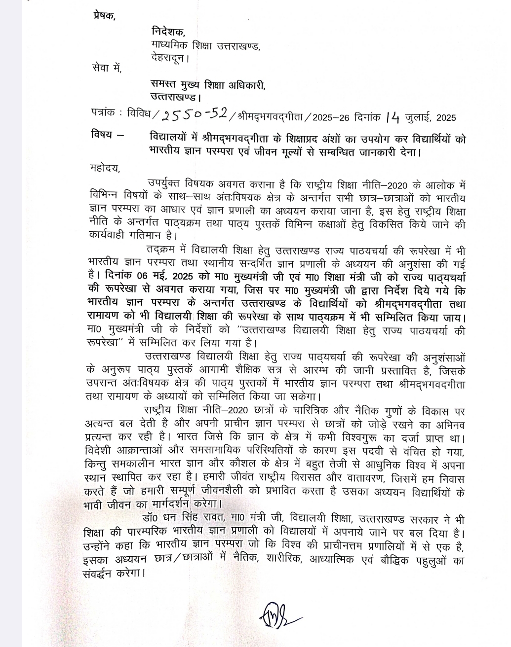 उत्तराखंड के स्कूलों में प्रार्थना सभा में श्रीमद् भागवत गीता के गूंजेंगे श्लोक,CM धामी के निर्देश पर आदेश हुआ जारी