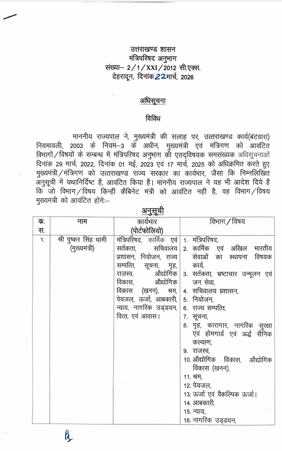 देहरादून। मुख्यमंत्री ने मंत्रिमंडल विस्तार के बाद मंत्रियों के बीच विभागों का बहुप्रतीक्षित बंटवारा कर दिया है। हाल ही में पाँच नए मंत्रियों के शपथ ग्रहण के बाद किए गए इस आवंटन में मुख्यमंत्री ने कई महत्वपूर्ण और संवेदनशील प्रशासनिक विभाग अपने पास ही रखे हैं। अब तक मुख्यमंत्री के पास 35 से अधिक विभागों का दायित्व था।