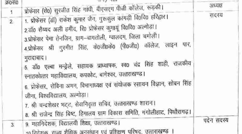 डॉ पराग ने बताया कि इसमें डॉ सुरजीत सिंह गांधी को अध्यक्ष, प्रोफ राकेश जैन, डॉ सैय्यद अली हमीद,प्रो पेमा तेनजिन , डॉ एल्बा मेड्रिले, प्रोफेसर रोबिना अमन,प्रो गुरमीत सिंह,को सदस्य बनाया गया है साथ ही समाज सेवी राजेंद्र बिष्ट और सेवानिवृत अधिकारी चंद्रशेखर भट्ट भी सदस्य होंगे। निदेशक महाविद्यालय शिक्षा, निदेशक राज्य शैक्षिक अनुसंधान, निदेशक अल्पसंख्यक कल्याण भी सदस्य सूची में रहेंगे।