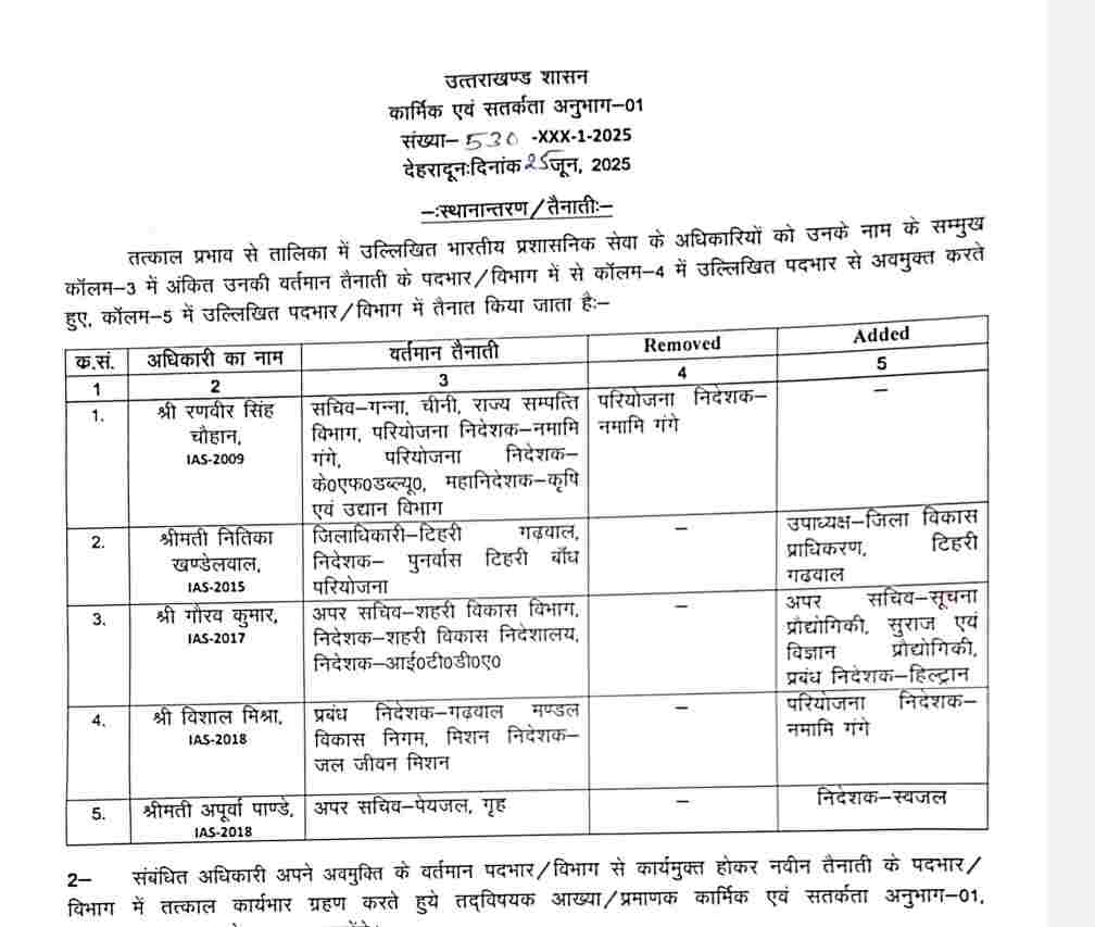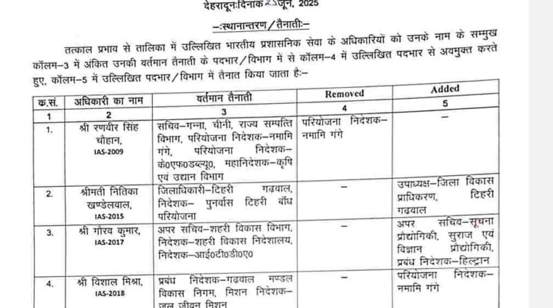 उत्तराखंड से बड़ी खबर कई आईएएस अधिकारियों के विभागों में फेरबदलाव,पढ़िए किन अधिकारियों के विभागों में हुआ बदलाव June 26, 2025 Apnu Uttarakhand