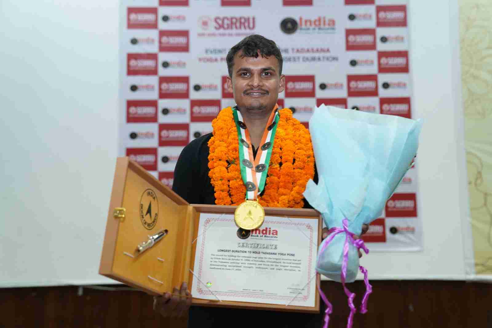 एसजीआरआर विश्वविद्यालय के योग छात्र उत्तम अग्रहरि ने ताड़ासन का बनाया राष्ट्रीय रिकार्ड,3 घण्टे 3 मिनट ताड़ासन की एक ही मुद्रा में लगातार खड़े रहकर हासिल की उपलब्धि