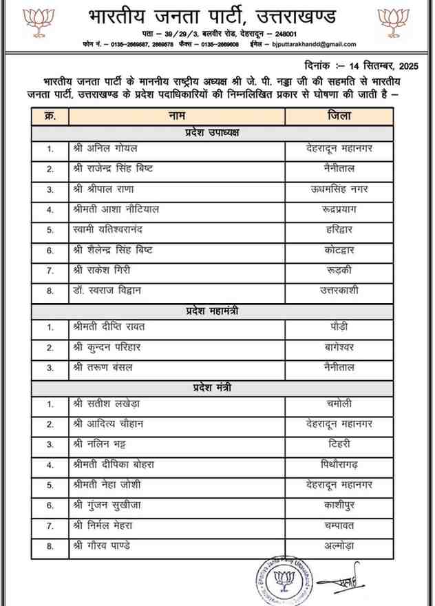 देहरादून। भारतीय जनता पार्टी (भाजपा) उत्तराखंड ने अपने संगठनात्मक ढांचे को मजबूती देते हुए प्रदेश पदाधिकारियों की नई सूची जारी कर दी है। इस सूची में कई नए चेहरों को अहम जिम्मेदारियां सौंपी गई हैं।