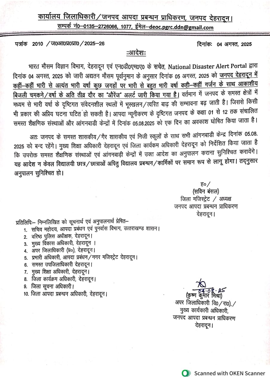 देहरादून। मौसम विभाग के द्वारा कल भी उत्तराखंड के कई जिलों में भारी से भारी बारिश का अनुमान जताया गया है, जिसको लेकर कई जिलों में प्रशासन के द्वारा अलर्ट भी किया गया है,वही देहरादून जिले में जिलाधिकारी के द्वारा 5 अगस्त को स्कूलों में छुट्टी घोषित की गई है।